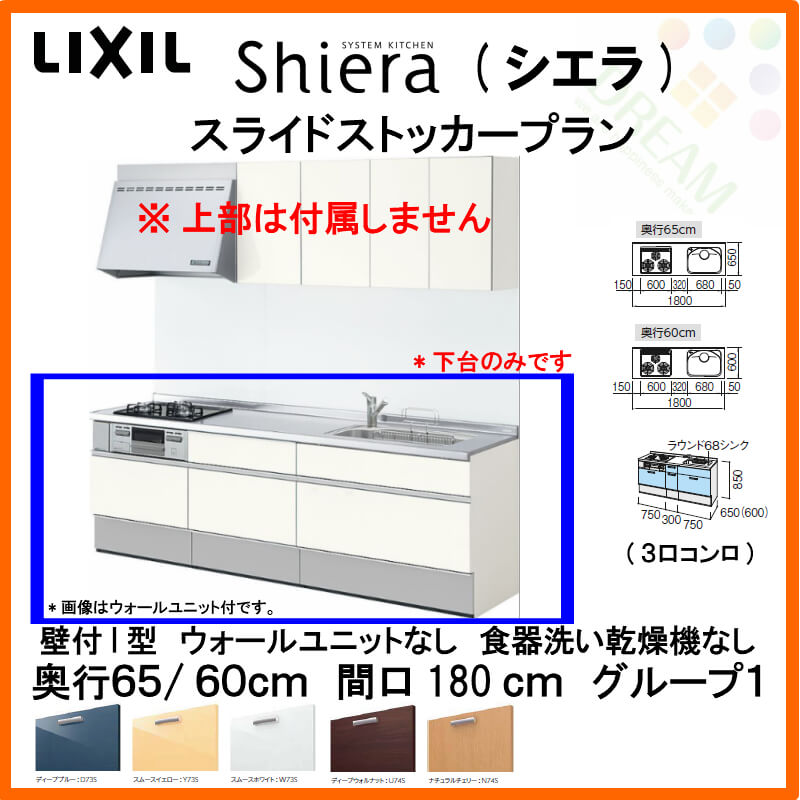 システムキッチン リクシル シエラ 壁付I型 スライドストッカー ウォールユニットなし 食器洗い乾燥機なし W1800mm 間口180cm(3口コンロ)×奥行65/60cm グループ1 流し台 建材屋