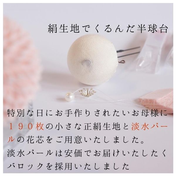 商品情報 キット内容 「半球台4.0cm(7cmユーピンセッティング済み」= 1本「1.5cm角の生地」= 190枚「花芯1個シルバー」バロック淡水真珠1個紐付き(紐が取れてしまった場合は市販の糸通しを使い通しなおしてください) 商品詳細)生地編 1.5cm角の生地が190枚素材)正絹 絹 シルクお色:ミテラのベビーピンク。