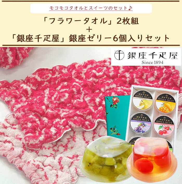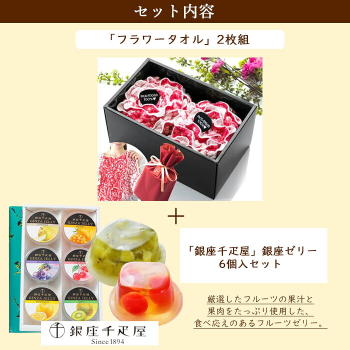 商品詳細 【フラワータオル】 フラワータオル:78cm×21cm ボックスサイズ:高さ21.5cm×11cm×D13.5cm 【「銀座千疋屋」銀座ゼリー6個入り】 内容量:ブルーベリー、さくらんぼ、グレープフルーツ、ラ・フランス、マンゴ、キウイ(各75g)×各1個 賞味期限:製造日から9か月(常温) 保存方法:直射日光、高温多湿を避けて保存。